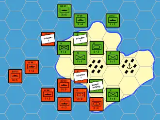 Une scène typique d'un wargame tactique, dans lequel un joueur rouge effectue un assaut amphibie contre un joueur vert.