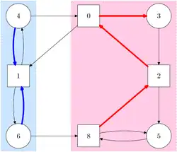 La figure ci-contre montre un graphe orienté à huit sommets. Le joueur 1 joue dans les sommets ronds et le joueur 2 joue dans les sommets carrés. Les numéros indiqués dans les sommets sont les couleurs. Par exemple, la couleur du sommet rond en haut à gauche est 4. Le joueur 1 gagne si la couleur la plus grande visitée une infinité de fois est paire. Ainsi, dans la zone bleue, le joueur 1 a une stratégie gagnante, donnée par les arcs en bleu. Si on part du sommet 1, un exemple de partie est 141416161414... et la couleur la plus grande visitée une infinité de fois est soit 4, soit 6, et est paire dans tous les cas.