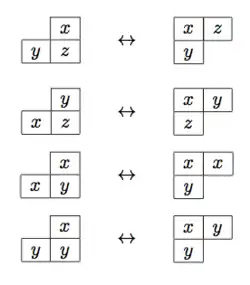 Tout tableau de Young gauche peut être transformé en un tableau de Young unique par une suite de glissements, donc tout tableau de Young gauche est équivalent à un tableau de Young. L'équivalence définie par les glissements est en fait la même que l'équivalence de Knuth qui définit le monoïde plaxique.