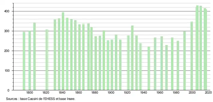 L'évolution du nombre d'habitants est connue à travers les recensements de la population effectués dans la commune depuis 1793. Pour les communes de moins de 10 000 habitants, une enquête de recensement portant sur toute la population est réalisée tous les cinq ans, les populations de référence des années intermédiaires étant quant à elles estimées par interpolation ou extrapolation[13]. Pour la commune, le premier recensement exhaustif entrant dans le cadre du nouveau dispositif a été réalisé en 2005[14].
