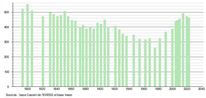 L'évolution du nombre d'habitants est connue à travers les recensements de la population effectués dans la commune depuis 1793. Pour les communes de moins de 10 000 habitants, une enquête de recensement portant sur toute la population est réalisée tous les cinq ans, les populations de référence des années intermédiaires étant quant à elles estimées par interpolation ou extrapolation[18]. Pour la commune, le premier recensement exhaustif entrant dans le cadre du nouveau dispositif a été réalisé en 2004[19].