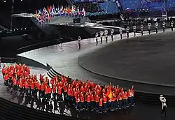 Durant la cérémonie d'ouverture, les athlètes défilent dans le stade olympique. La délégation grecque, pour des raisons historiques, ouvre le défilé. Le reste des délégations défile par ordre alphabétique dans la langue du pays hôte (ou en anglais en 2019[9]). La délégation du pays hôte ferme la marche[7].