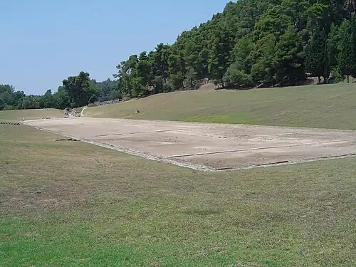 De nombreuses légendes entourent l'origine des Jeux olympiques antiques. L'une dit qu'Héraclès construisit le stade olympique ainsi que les bâtiments alentour en l'honneur de son père Zeus, après avoir accompli ses douze travaux, et aurait organisé avec ses quatre frères une course dont il couronna le vainqueur d'une branche d'olivier[8]. Il aurait également défini la longueur du stade olympique en l'arpentant avec la longueur de son pied en avançant de 600 pas.