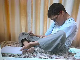 Née avec une infirmité motrice cérébrale, Jhamak Ghimire écrit avec son pied gauche[2].