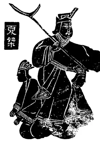 Il aurait régné de -1818 à -1767. Il fut intronisé l'année de Renchen (壬辰) et fixa sa capitale à Zhenxun (斟鄩). Il n'était pas un mauvais dirigeant, jusqu'au jour où il découvrit Moxi (末喜), qui devint sa concubine. À partir de ce moment, il ne prêta plus d'attention aux affaires d'états. Moxi prétendit avoir corrompu le roi grâce à son adresse sexuelle. La débauche était devenue son passe-temps préféré, et Moxi fit construire un lac de vin et ordonna à trois mille hommes de le boire en entier. Elle rit au moment où ils se noyèrent tous.