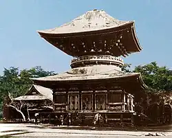 - ↑ Le terme renvoie à la théorie honji suijaku, selon laquelle certains kamis ne sont en fait que des manifestations locales (suijaku, littéralement « traces ») de dieux bouddhistes distants (honji, littéralement « terre d'origine »). Honji-dō peut donc se traduire par « salle du dieu bouddhiste qui est la terre d'origine du kami du sanctuaire » (sa manifestation locale).