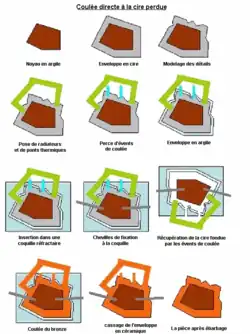 Cette technique consiste à fabriquer un modèle en métal qui servira à réaliser un moule. Ce moule sera ensuite utilisé pour produire une ou plusieurs pièces. De la cire chaude est injectée dans le moule et les pièces en cire obtenues sont utilisées pour reproduire la pièce avec la technique de coulée à la cire perdue. Les pièces moulées sont ensuite polies soit par un procédé mécanique soit par un procédé chimique.