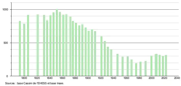 L'évolution du nombre d'habitants est connue à travers les recensements de la population effectués dans la commune depuis 1793. Pour les communes de moins de 10 000 habitants, une enquête de recensement portant sur toute la population est réalisée tous les cinq ans, les populations de référence des années intermédiaires étant quant à elles estimées par interpolation ou extrapolation[18]. Pour la commune, le premier recensement exhaustif entrant dans le cadre du nouveau dispositif a été réalisé en 2007[19].