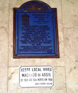 Le , à 3 heures 20, dans son logis de Cosme Velho[62], Machado de Assis s’éteignit, à l’âge de 69 ans, atteint d’un ulcère cancéreux dans la bouche[91] ; le certificat de décès indique qu’il mourut d’artériosclérose généralisée, y compris de sclérose cérébrale, ce qui, pour certains, demeure discutable étant donné qu’il s’était montré lucide dans ses dernières lettres[90]. Il eut, globalement, une mort tranquille, entouré des amis les plus intimes qu’il s’était faits à Rio de Janeiro : Mário de Alencar, José Veríssimo, Coelho Neto, Raimundo Correia, Rodrigo Otávio, Euclides da Cunha, etc.[86] Cette même année, ce dernier relata dans les colonnes du Jornal do Comércio : « La nuit où Machado de Assis décéda, celui qui eût pénétré dans le logis du poète, à Laranjeiras, n’aurait pas cru qu’il fût aussi proche du dénouement de sa maladie », et poursuivit : « Dans la salle à manger, que l’on disait la chambre à coucher du cher maître, un groupe de dames – hier encore enfants, qu’il avait portés sur les épaules, aujourd’hui très-nobles mères de famille – lui commentaient les faits enchanteurs de la vie et lui relisaient d’anciens vers, encore inédits, avarement gardés dans des albums capricieux »[92].