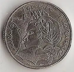 L'avers est le côté de la pièce qui porte la représentation de l'autorité émettrice (République française ou « RF ») qui garantit la valeur de la monnaie.