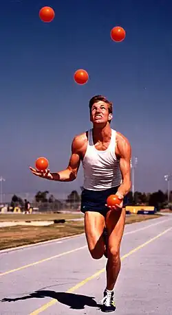Le Joggling est un mélange de jonglerie et de jogging, c’est un mot-valise. Le rythme de la jonglerie à trois objets correspond parfaitement à l’action et au pas de la course, ce qui fait du joggling un travail du corps complet et amusant. C’était un passe-temps récréatif dans beaucoup de tribus amérindiennes.