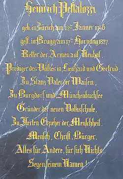 Influencé par les idées de Jean-Jacques Rousseau, il voue sa vie à l'éducation des enfants pauvres. En 1782 il est affilié aux Illuminés de Bavière sous le nom d'Alfred[4]. En , la bataille de Stockach a laissé derrière elle de multiples orphelins. C'est pour cette raison que Johann Heinrich Pestalozzi a été appelé afin de former un orphelinat. Par la suite, il va chercher à éduquer et former tous les enfants qui sont en sa présence, même s'ils refusent au départ cette éducation[5]. Il pense une école à laquelle les parents devront envoyer leurs enfants, dispensant des premiers apprentissages et mettant en œuvre une pédagogie active, en lien avec les besoins environnants des enfants et la profession à laquelle ils sont promis. Les diverses écoles qu'il fonde — notamment à Stans, Berthoud et Yverdon-les-Bains — servent de modèles dans toute l'Europe. Ses méthodes d'éducation nouvelle, concrètes et directes, fondées sur le développement progressif de toutes les facultés, sont exposées dans ses ouvrages, dont le roman humanitaire Léonard et Gertrude (1781-1787) et l'essai Comment Gertrude instruit ses enfants (1801).