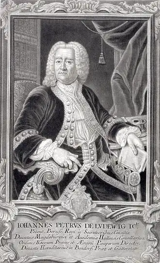 - ↑ one of the leading German jurists and historians of the early 18th century. Voir (en) Mike Widener, « Johann Peter von Ludewig », Lillian Goldman Law Library, Yale Law School, Yale University, (consulté le )