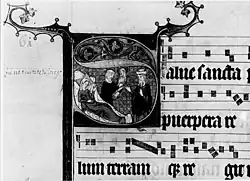 - ↑ Le texte de la dédicace se lit mieux sur le graduel de Bonn.