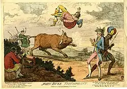 Créé par John Arbuthnot en 1712 et repris par le dessin de presse (James Gillray, Thomas Rowlandson, George Cruikshank) et les bandes dessinées, y compris aux États-Unis (Thomas Nast), John Bull est un bourgeois grassouillet portant un chapeau haut-de-forme et dont le gilet est taillé dans un Union Jack. Il est fréquemment accompagné d'un bulldog. Gentleman farmer conservateur, il sera explicitement utilisé comme antithèse du sans-culotte pendant la Révolution française[3],[4]. Il est souvent mis à contribution pour les mobilisations militaires nationales, John Bull est l'homologue de l'Oncle Sam.