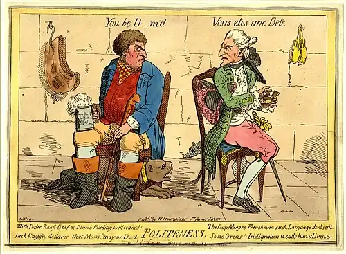 « Cartoon caricatures took comic pride in the ever corpulent John Bull, in sharp contrast to the onion-nibbling, starveling French peasant, a bag of bones, or the effete, effeminized Versailles courtier, dolled up in the latest foppish fashions but, insect-like, without an ounce of flesh, signifying a lack of virility.