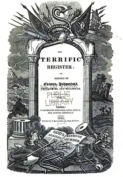 - ↑ (en) The terrific register; or, Record of crimes, judgments, providences, and calamities, notice du catalogue de The Hathi Trust Library.