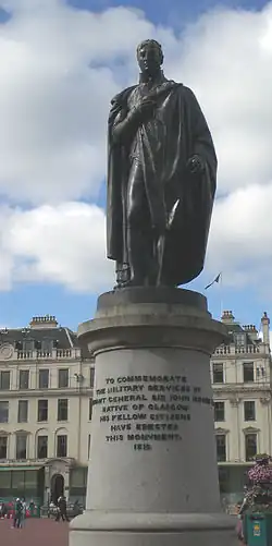 Quand les Français prennent la ville, Soult ordonne la construction d'un monument au-dessus de sa tombe[3]. Dans la cathédrale Saint-Paul de Londres, un monument rappelle sa mémoire, ainsi qu'une statue érigée sur le George Square, dans sa ville natale de Glasgow, et qu'une statue équestre à Cheriton dans le Kent. Des salles portent encore son nom au High School of Glasgow et au Queen Victoria School', à Dunblane.