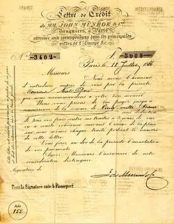 John Munroe[2] ouvre en 1836 au 8 Wall Street (Manhattan) une maison de banque qui se spécialise dans les transactions financières liées aux transports maritimes. Après avoir ouvert un autre établissement à Boston, John Monroe décide en 1851 d'ouvrir une filiale à Paris, au 5, rue de la Paix. Qualifiée de banque, le bureau parisien prend le nom de John Munroe & Co. et brasse de nombreuses affaires, devenant l'intermédiaire obligé de la plupart des businessmen tant américains que français ou anglais, pour toutes les transactions entre les deux pays.