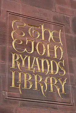 La John Rylands Library est fondée par Enriqueta Augustina Rylands (La Havane, 1843 - Torquay, 1908), veuve de John Rylands (Saint Helens, 1801 - Stretford, 1888), magnat du textile (et premier multi-millionnaire de Manchester), elle est ouverte au public en janvier 1900. Elle est installée dans un bâtiment néo-gothique en grès de Cumbria, évoquant une église (ou un bâtiment d'Oxford), édifié entre 1890 et 1899 par l'architecte Basil Champneys, inauguré le , bâtiment classé depuis 1952, sur la 1re liste des bâtiments de Manchester depuis 1994. En , la John Rylands Library fusionne avec la bibliothèque de l'université de Manchester, pour former la John Rylands University Library of Manchester. Le site historique de Deansgate est destiné par ce nouvel établissement à abriter les « collections spéciales »[1].