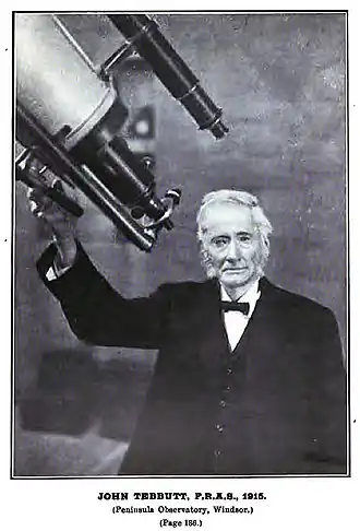 - ↑ Wood, Harley, « Tebbutt, John 1834–1916 », Australian Dictionary of Biography, Australian Capital Territory, Australian National University, (lire en ligne)