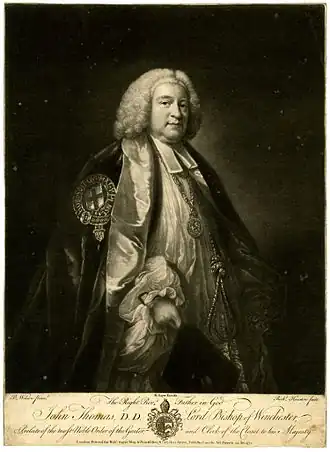 En 1742, Thomas devient chanoine de St Paul's, et conserve ce poste jusqu'en 1748. En 1742, il est nommé aumônier de George II et prêche les conférences Boyle, qu'il ne publie pas ; et, ayant obtenu la faveur du roi lorsqu'il est prince de Galles, il reçoit l'évêché de Peterborough et est consacré évêque au palais de Lambeth le 4 octobre 1747 [1].