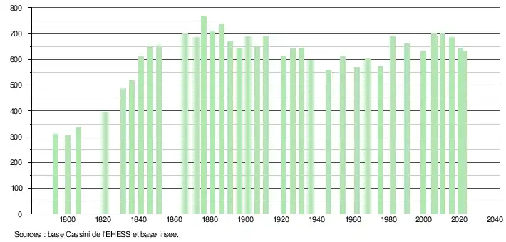L'évolution du nombre d'habitants est connue à travers les recensements de la population effectués dans la commune depuis 1793. Pour les communes de moins de 10 000 habitants, une enquête de recensement portant sur toute la population est réalisée tous les cinq ans, les populations de référence des années intermédiaires étant quant à elles estimées par interpolation ou extrapolation[27]. Pour la commune, le premier recensement exhaustif entrant dans le cadre du nouveau dispositif a été réalisé en 2005[28].