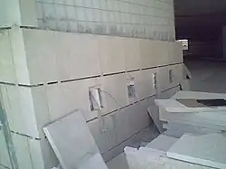 Les joints des parements en pierre de taille agrafée sont remplis de ciment, de mastic, ou de silicone. Il faut veiller à ce que le matériau utilisé ne transsudera pas dans la pierre.