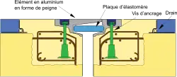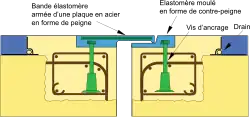 Le joint utilise ici les propriétés élastiques d’une bande en élastomère (dénommée plaque pont) pour permettre les mouvements prévus de la structure.