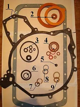- fig. 7 : joint de vidange métalloplastique utilisé sur les moteurs thermiques pour assurer l’étanchéité des bouchons de vidange des huiles moteurs. Constitué de deux flasques extérieures en cuivre enserrant une âme de fibre. Ce joint à l’état neuf a une épaisseur d’environ 2,5 mm, qui s’écrase sous l’effet du serrage, assurant l’étanchéité entre le bouchon de vidange et la carter. Il résiste à de très hautes températures et à la déformation possible des organes. Il doit être changé, si possible, à chaque démontage. Les dimensions sont standards et varient en fonction des fabricants de moteurs.