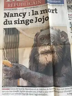 - ↑ Anne-Laure Chery pour France 3, « Nancy donne le nom d’une allée au chimpanzé Jojo, "pour que les animaux ne soient plus un divertissement" »,