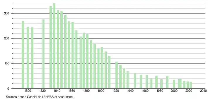 L'évolution du nombre d'habitants est connue à travers les recensements de la population effectués dans la commune depuis 1793. Pour les communes de moins de 10 000 habitants, une enquête de recensement portant sur toute la population est réalisée tous les cinq ans, les populations de référence des années intermédiaires étant quant à elles estimées par interpolation ou extrapolation[20]. Pour la commune, le premier recensement exhaustif entrant dans le cadre du nouveau dispositif a été réalisé en 2008[21].