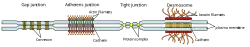 - les jonctions d'ancrage : elles peuvent être maculaires (macula adhérence = jonction sous forme de disque) ou zonulaires (zonula adhérence = ceinture d'adhérence). Elles assurent la cohérence mécanique des tissus animaux en unissant les cellules adjacentes entre elles.