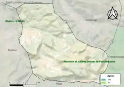 L'occupation des sols de la commune, telle qu'elle ressort de la base de données européenne d’occupation biophysique des sols Corine Land Cover (CLC), est marquée par l'importance des forêts et milieux semi-naturels (78,8 % en 2018), une proportion sensiblement équivalente à celle de 1990 (78,6 %). La répartition détaillée en 2018 est la suivante : milieux à végétation arbustive et/ou herbacée (59,7 %), cultures permanentes (20,9 %), forêts (19,2 %), zones agricoles hétérogènes (0,3 %)[21]. L'évolution de l’occupation des sols de la commune et de ses infrastructures peut être observée sur les différentes représentations cartographiques du territoire : la carte de Cassini (XVIIIe siècle), la carte d'état-major (1820-1866) et les cartes ou photos aériennes de l'IGN pour la période actuelle (1950 à aujourd'hui)[Carte 2].