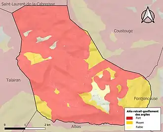 Le retrait-gonflement des sols argileux est susceptible d'engendrer des dommages importants aux bâtiments en cas d’alternance de périodes de sécheresse et de pluie. 95,5 % de la superficie communale est en aléa moyen ou fort (75,2 % au niveau départemental et 48,5 % au niveau national). Sur les 45 bâtiments dénombrés sur la commune en 2019, 45 sont en aléa moyen ou fort, soit 100 %, à comparer aux 94 % au niveau départemental et 54 % au niveau national. Une cartographie de l'exposition du territoire national au retrait gonflement des sols argileux est disponible sur le site du BRGM[24],[Carte 3].