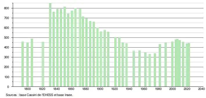 | L'évolution du nombre d'habitants est connue à travers les recensements de la population effectués dans la commune depuis 1793. Pour les communes de moins de 10 000 habitants, une enquête de recensement portant sur toute la population est réalisée tous les cinq ans, les populations de référence des années intermédiaires étant quant à elles estimées par interpolation ou extrapolation[27]. Pour la commune, le premier recensement exhaustif entrant dans le cadre du nouveau dispositif a été réalisé en 2004[28]. En 2022, la commune comptait 443 habitants[Note 4], en évolution de −1,77 % par rapport à 2016 (Tarn : +2,52 %, France hors Mayotte : +2,11 %). |