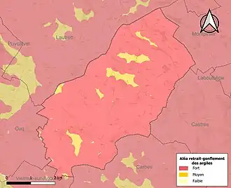 La commune est vulnérable au risque de mouvements de terrains constitué principalement du retrait-gonflement des sols argileux[22]. Cet aléa est susceptible d'engendrer des dommages importants aux bâtiments en cas d’alternance de périodes de sécheresse et de pluie. La totalité de la commune est en aléa moyen ou fort (76,3 % au niveau départemental et 48,5 % au niveau national). Sur les 200 bâtiments dénombrés sur la commune en 2019, 200 sont en aléa moyen ou fort, soit 100 %, à comparer aux 90 % au niveau départemental et 54 % au niveau national. Une cartographie de l'exposition du territoire national au retrait gonflement des sols argileux est disponible sur le site du BRGM[23],[Carte 3].