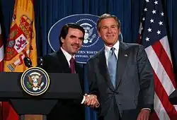 Sur le plan international, il accentue le rapprochement avec les États-Unis dans une optique atlantiste et entretient d'excellentes relations - y compris personnelles[47] - avec George W. Bush qu'il soutient contre son opinion publique lors de la guerre d'Irak en mars 2003. Son engagement dans la guerre en Irak est rejeté par une écrasante majorité d'Espagnols, des manifestations d'une ampleur jamais vue en Espagne, rassemblent plusieurs millions de personnes[48].