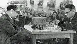 Capablanca (à g.) face à Mikhaïl Botvinnik à Moscou, en 1936.