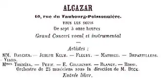 - ↑ Paru dans La Chanson. Journal hebdomadaire de critique littéraire et musicale, Revue des Théâtres, Concerts et Cafés-Concerts, numéro 8, 15 janvier 1863, page 5.