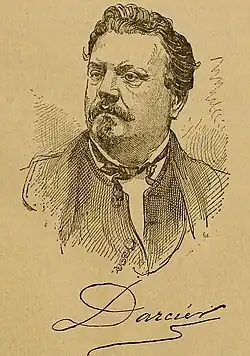 La vogue de Darcier dura deux années, accrue encore par l'ouverture des concerts populaires de La Fraternité, à la salle Martel. De son fait, Jean Raisin y naquit pour vivre jusqu'aux derniers jours de la chanson française. L'artiste se partageait, sans fatigue et avec des chances égales, entre La Fraternité et l’Estaminet lyrique. Le théâtre des Variétés, proche voisin de ce dernier concert, finit par s'émouvoir d'une concurrence redoutable ; il engagea Darcier, mais pour le soumettre au débilitant régime de la romance : ainsi compris, le traité n'eut et ne pouvait avoir qu'une courte durée. Affranchi, Darcier composa les airs superbes des chansons de Charles Gille, entreprit une excursion en Belgique, et chanta successivement à Lyon, au Casino lyrique de Saint-Étienne[4], à Marseille, au Havre et dans quelques autres villes ; la province et l'étranger ratifièrent les favorables jugements de Paris, où l'artiste revint pour faire d'heureuses campagnes au Café de France et à celui de la Géante. Puis, Offenbach l'admit dans la troupe des Bouffes-Parisiens qu'il formait. Le soir même de l'ouverture du nouveau théâtre, Darcier débutait, en compagnie de Berthelier, dans une saynète d'Édouard Plouvier et Offenbach, la Nuit blanche (5 juillet 1855). Ce fut un succès, bien dépassé par celui du Violoneux de Mestépès, Chevalet et Offenbach, qu'on donna le 31 août suivant : Darcier y joua la scène du violon brisé avec un pathétique saisissant. Mais si le chanteur trouvait aux Bouffes l'occasion de triomphes, le compositeur moins heureux ne pouvait songer à se produire en concurrence avec un directeur égoïste ; Darcier, bien édifié, rompit pour entrer au Casino du Palais-Royal. Deux ans plus tard, le 25 avril 1857, il obtenait au théâtre Beaumarchais, dans l'Enfant du tour de France, drame de Charles Vincent et Lermite, le plus retentissant et le plus légitime des succès.
