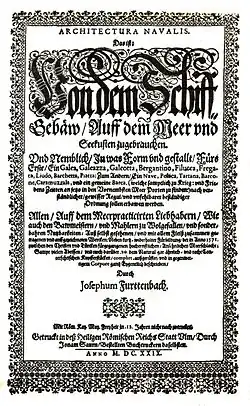 Furttenbach, Josef : Architectura navalis, das ist von dem Schiff, Gebäw auff dem Meer und Seeküsten zugebrauchen... durch Josephum Furttenbach; Ulm : getruckt durch J. Saurn, 1629; In-fol., pièces limin. et 134 p., pl. gravées. Notice n° : FRBNF30471365.