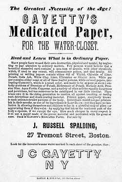 Joseph C. Gayetty[1] de New York est celui qui a inventé le papier hygiénique en 1857. Il était produit sous l'appellation de Gayetty's Medicated Paper par la Joseph C. Gayetty Company et était vendu en paquets de 500 feuilles au prix de 50 cents le paquet. La particularité de Gayetty était de marquer chaque feuille avec un filigrane à son propre nom[2]. Dans un but prophylactique le papier contenait une certaine quantité d'aloès : on ne le recommandait donc pas seulement pour des questions d'hygiène mais aussi pour la prévention des hémorroïdes.