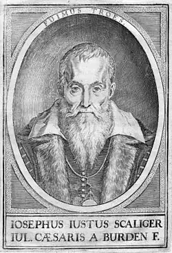 Joseph Juste Scaliger, fils de Jules César Scaliger, né le à Agen et mort le à Leyde, est l'un des plus grands érudits français du XVIe siècle. Il surpassa son père comme philologue, et se fit en outre un nom comme chronologiste et historien. Il fut longtemps sous la protection amicale de la famille de Chasteigner, et parcourut la France, l'Allemagne, l'Italie, l'Écosse. Il embrassa la religion réformée (1562) et fut précepteur de cette même famille noble au sud de la Touraine, notamment dans leur château de Preuilly[1], il fut nommé professeur à l’Académie de Genève et ensuite appelé à l’Académie de Leyde en 1593, comme successeur de Juste Lipse.