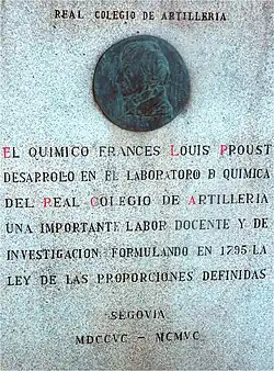 En 1778 Proust[3] est recruté par le séminaire royal de Vergara, Guipuscoa, pour enseigner la chimie. Il demeure près de deux ans dans cette institution, où il installe les laboratoires de chimie et métallurgie. En 1786, à la suite d'un accord entre Louis XVI et Charles III d'Espagne et grâce au soutien de Lavoisier, il prend en charge l'enseignement de la chimie et de la métallurgie au collège royal d'artillerie situé dans l'Alcazar de Ségovie. Jusqu'en 1799 il y enseigne pendant des sessions de quatre mois à raison de trois leçons par semaine. Le laboratoire du collège royal sera alors équipé des meilleurs moyens disponibles à l'époque. Proust y réalise de nombreuses expériences sur la composition de diverses substances, ce qui le conduira à établir et à confirmer la loi des proportions définies.