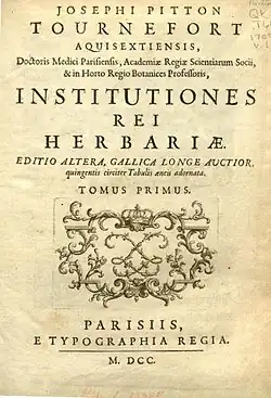 - ↑ Joseph Pitton de Tournefort, Josephi Pitton Tournefort,... Institutiones rei herbariae. Tomus 1, Typographia regiaTypographia regia (Parisiis), 1700-1703 (lire en ligne)