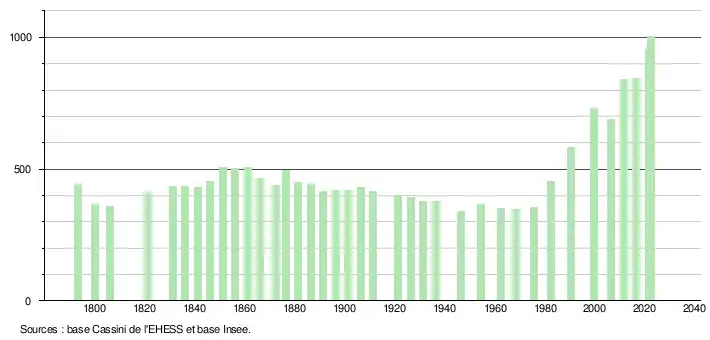 L'évolution du nombre d'habitants est connue à travers les recensements de la population effectués dans la commune depuis 1793. Pour les communes de moins de 10 000 habitants, une enquête de recensement portant sur toute la population est réalisée tous les cinq ans, les populations de référence des années intermédiaires étant quant à elles estimées par interpolation ou extrapolation[25]. Pour la commune, le premier recensement exhaustif entrant dans le cadre du nouveau dispositif a été réalisé en 2006[26].