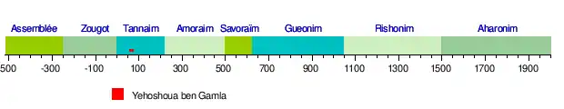 - ↑ T.B. Baba Batra 21a : אמר רב יהודה אמר רב: ברם זכור אותו האיש לטוב ויהושע בן גמלא שמו, שאלמלא הוא נשתכחה תורה מישראל, שבתחילה מי שיש לו אב מלמדו תורה, מי שאין לו אב לא היה למד תורה... עד שבא יהושע בן גמלא ותיקן שיהו מושיבין מלמדי תינוקות בכל מדינה ומדינה ובכל עיר ועיר ומכניסין אותן כבן שש כבן שבע (Rav Yehouda a dit au nom de Rav : Cependant, ce même homme est remémoré en bien, et son nom est Yehoushoua ben Gamla, car sans lui, la Torah aurait été oubliée en Israël ; au début, celui qui avait un père, il [le père] lui enseignait la Torah, celui qui n'avait pas de père n'apprenait pas la Torah [...] jusqu'à ce que vienne Yehoshoua ben Gamla, qui édicta qu'on réinstitue des enseignants pour enfants dans tous les états et toutes les villes, et qu'on le fasse entrer [l'enfant] à six ou sept ans).