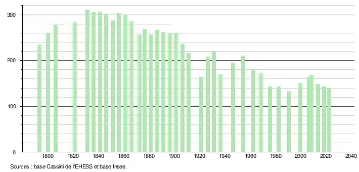 L'évolution du nombre d'habitants est connue à travers les recensements de la population effectués dans la commune depuis 1793. Pour les communes de moins de 10 000 habitants, une enquête de recensement portant sur toute la population est réalisée tous les cinq ans, les populations de référence des années intermédiaires étant quant à elles estimées par interpolation ou extrapolation[21]. Pour la commune, le premier recensement exhaustif entrant dans le cadre du nouveau dispositif a été réalisé en 2008[22].