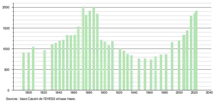 L'évolution du nombre d'habitants est connue à travers les recensements de la population effectués dans la commune depuis 1793. Pour les communes de moins de 10 000 habitants, une enquête de recensement portant sur toute la population est réalisée tous les cinq ans, les populations de référence des années intermédiaires étant quant à elles estimées par interpolation ou extrapolation[17]. Pour la commune, le premier recensement exhaustif entrant dans le cadre du nouveau dispositif a été réalisé en 2005[18].